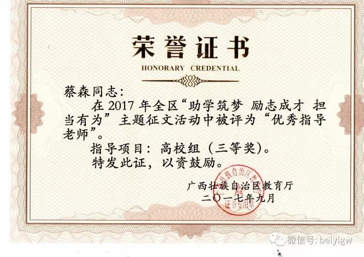 根据桂教资助〔2017〕17号文件精神,获悉我院在2017年全区“助学筑梦、励志成才、担当有为”主题征文活动活动中喜获佳绩。我院环境艺术学院2016级学生卢江春《多年以后,愿我们过得都能像自己》荣获高校组优秀征文作品三等奖,我院教师蔡森荣获优秀指导老师称号。