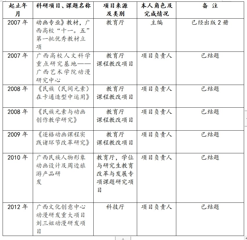 1986年7月~2020年7月,任职于广西艺术学院设计学院动画教研室主任;是广西艺术学院动画专业创始人,动画专业及动画学科、学术带头人;2008年获自治区高校重点实验基地——广西艺术学院动漫艺术研究中心(负责人);2008年成为广西高校首个动画艺术语言方向硕士生导师。
