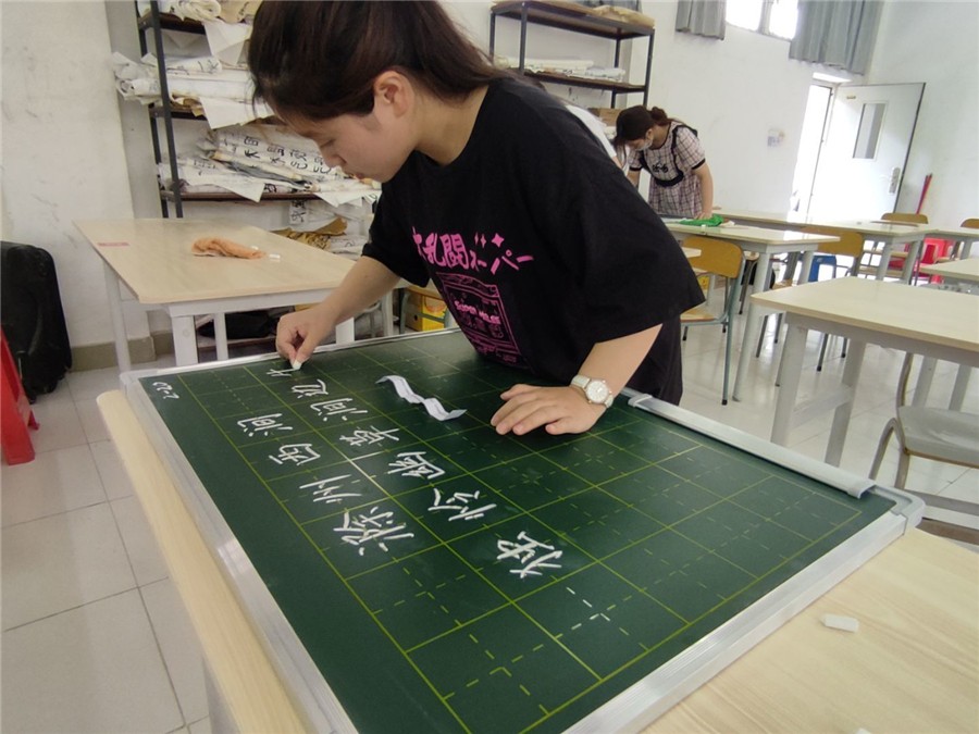 比赛中,同学们粉笔轻舞飞扬,或顿挫有致,或苍劲有力,或清秀雅致,一笔一划,一行行整齐的粉笔字跃然于面前,展示出较强的专业能力。