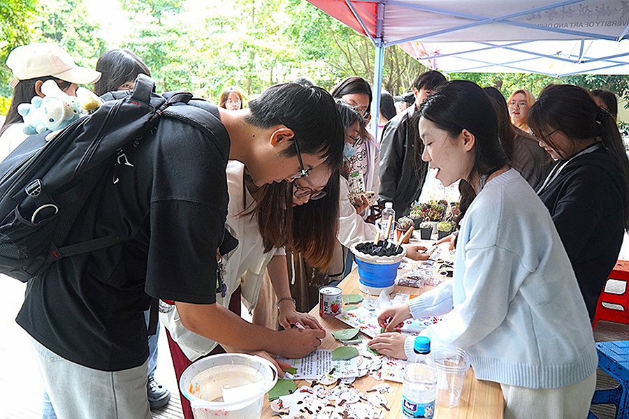 活动当天,设计艺术学院青志协团队将1000个植物盲袋,巧妙布设于校园景观节点之间:西区操场的榕树下、图书馆旁文化长廊、石头林林荫道、校园中心湖畔……生们在春日暖阳中开启了一场别开生面的寻宝之旅。每个盲盒内附小型玩偶、活动指南以及保护植物宣言,将环保理念具象为可触可感的载体。