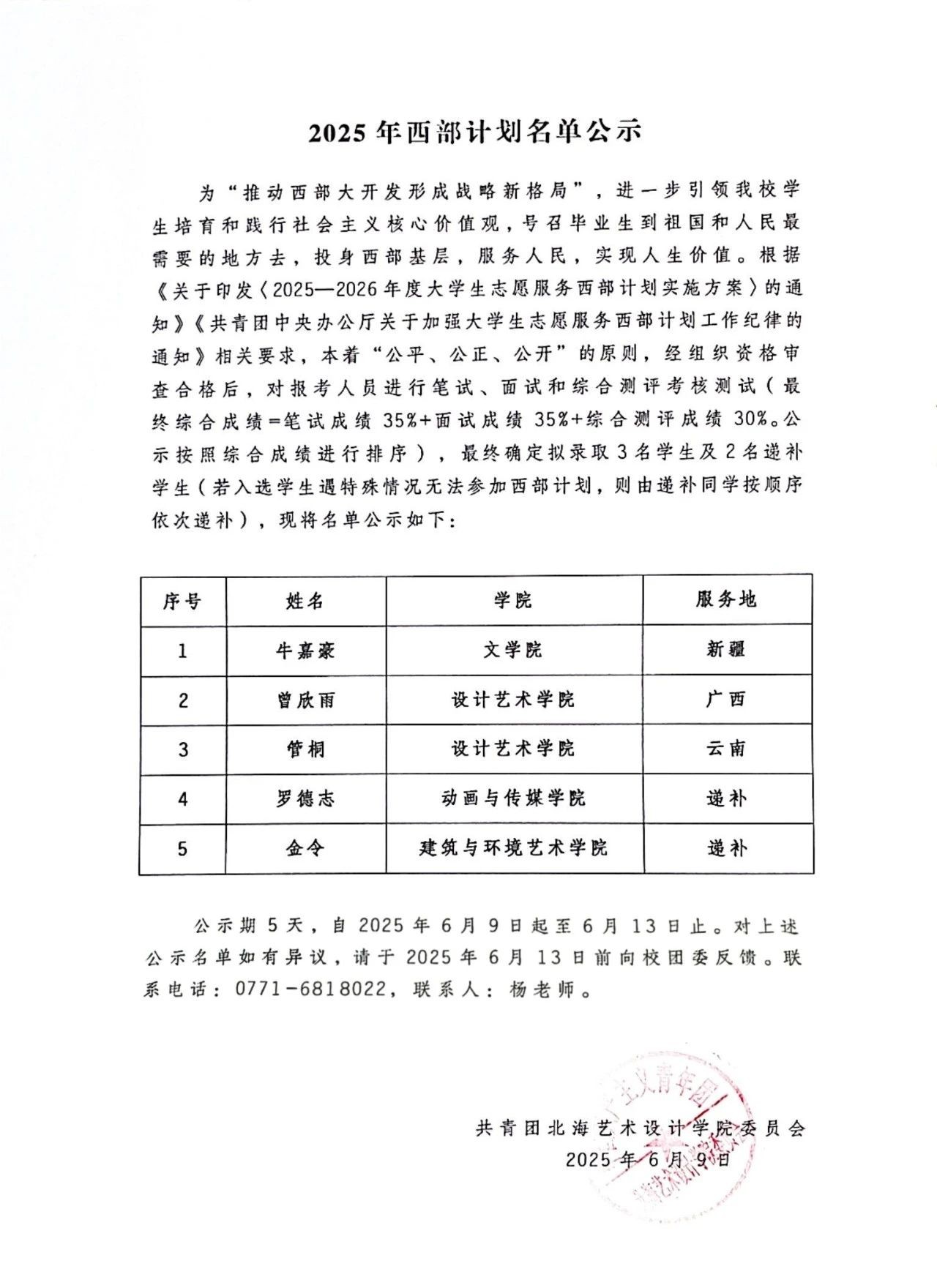 北海艺术设计学院2025年西部计划名单公示