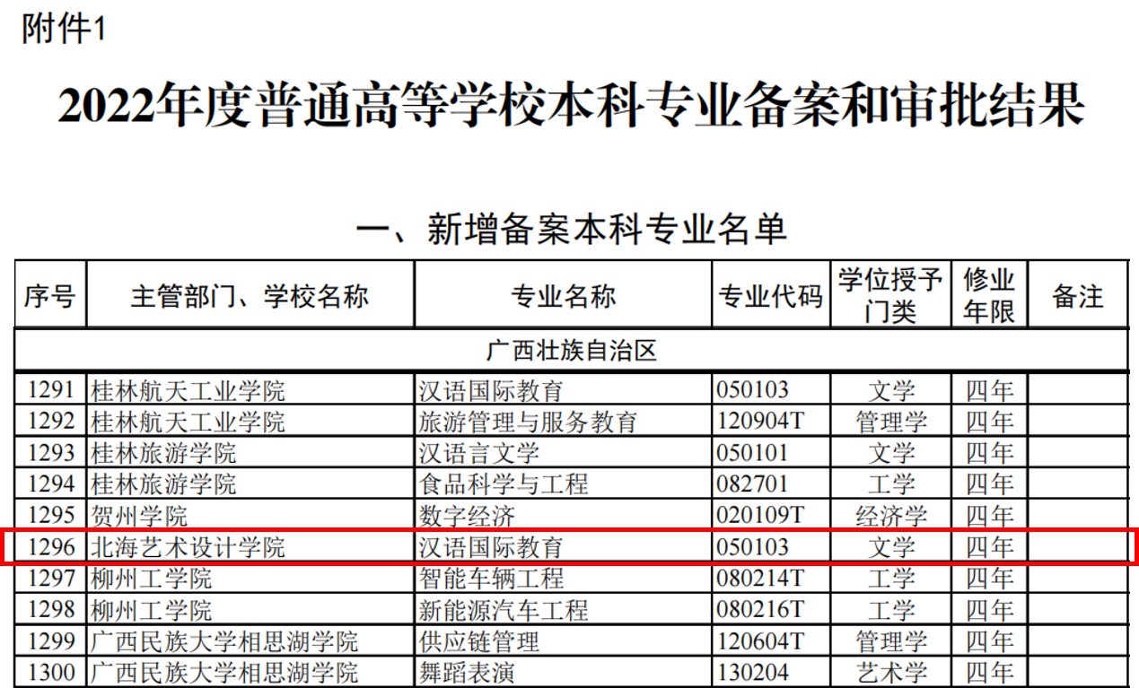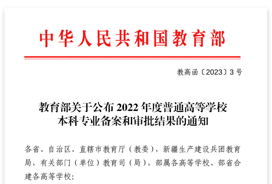 根据《教育部关于公布2022年度普通高等学校本科专业备案和审批结果的通知》(教高函〔2023〕3号),教育部对我校申请备案的汉语国际教育(专业代码050103)专业予以备案。