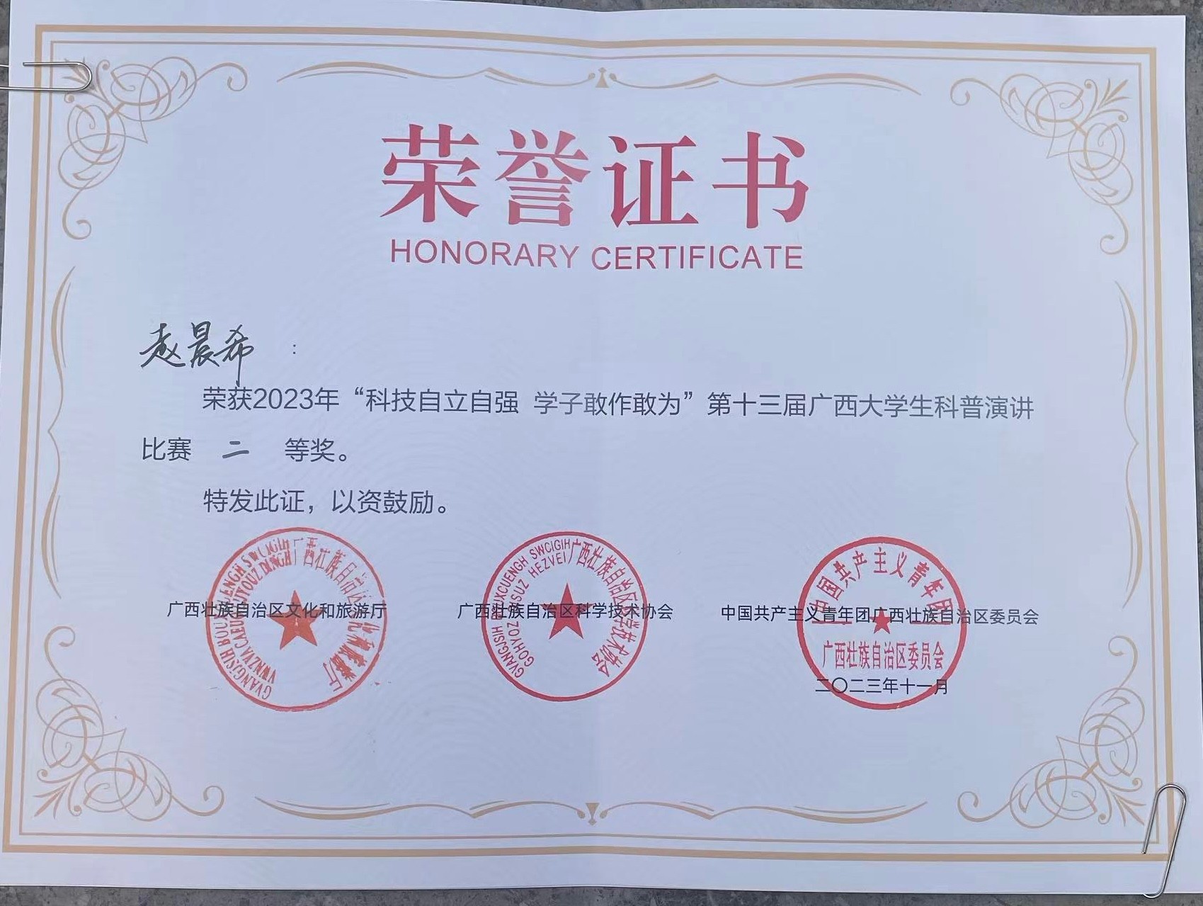 赵晨希同学获二等奖