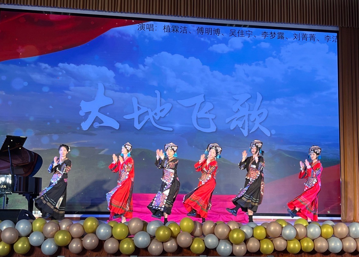 《大地飞歌》这首在八桂大地家喻户晓的新民歌,在同学们的载歌载舞中以欢快的节奏、明朗的曲调、浓郁的壮族民族风韵将演出现场气氛推向高潮。