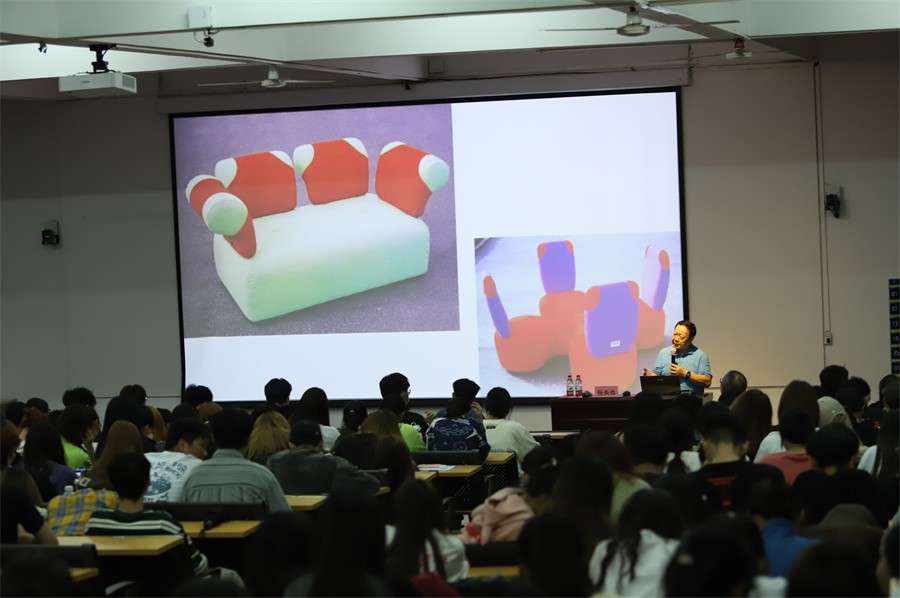 讲座开始,张夫也教授简单概述了艺术与设计的形象思维,强调了形象思维在设计中的重要地位,他通过评析油画《大家族》中的内容,向在场师生介绍作品里体现的形象思维,展示了一种强烈、另类的想象空间。张教授详细阐述了人类头脑对自然界的事物的高级反应和高级认知,讲解了智力与智慧的内在联系,进一步引出“智力是一种有结构的能力系统,想象是一种特殊形式的思维”的观点,向在场师生介绍思维的特点和分类:形象思维、抽象思维、灵感思维和创造性思维,并进一步解析其中的内在含义,张教授又通过一系列的国内外知名的设计作品与案例,生动形象地展示了每一个作品所体现的思维特点,令广大师生对思维有了更深刻的认识。