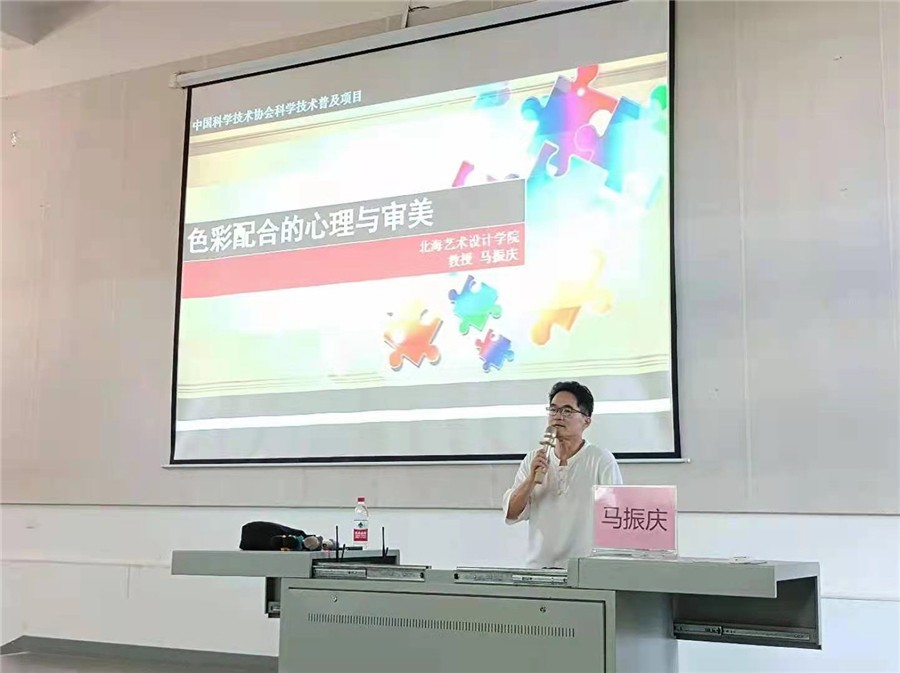 2021年5月21日15时,在我校功德楼107,齐齐哈尔大学美术与艺术设计学院马振庆教授为我校师生带来一场题为《色彩配合的心理与审美》的精彩讲座,产品系宋歌老师主持讲座。