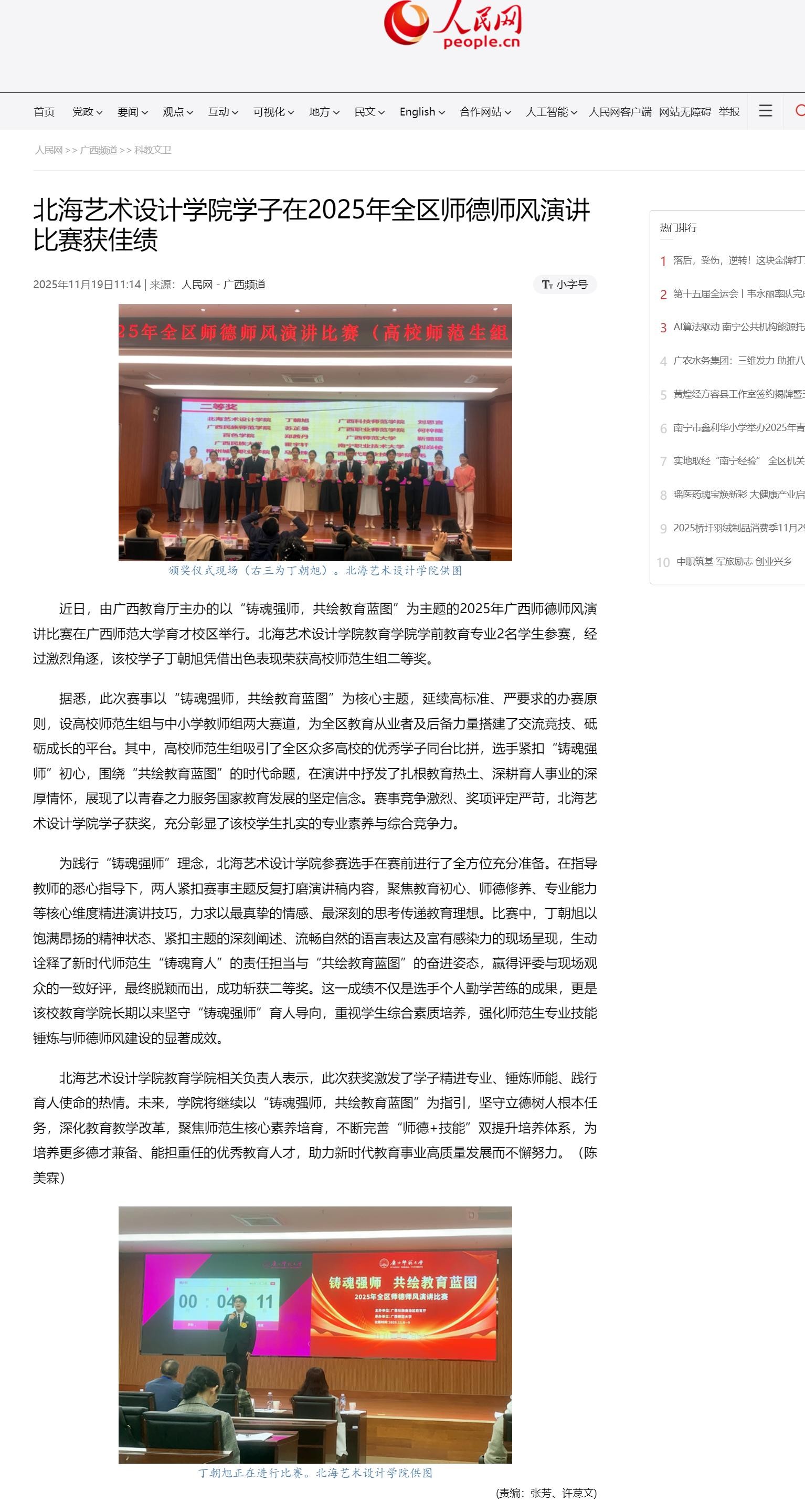 人民网:北海艺术设计学院学子在2025年全区师德师风演讲比赛获佳绩