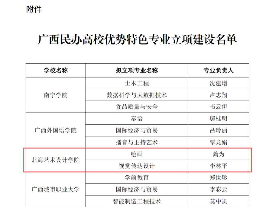 近日,广西壮族自治区教育厅下发《自治区教育厅关于公布广西民办高校优势特色专业建设项目立项名单的通知》(桂教民办〔2022〕15号),公布了2022年度广西民办高校优势特色专业立项建设名单。我校绘画和视觉传达设计专业入选。