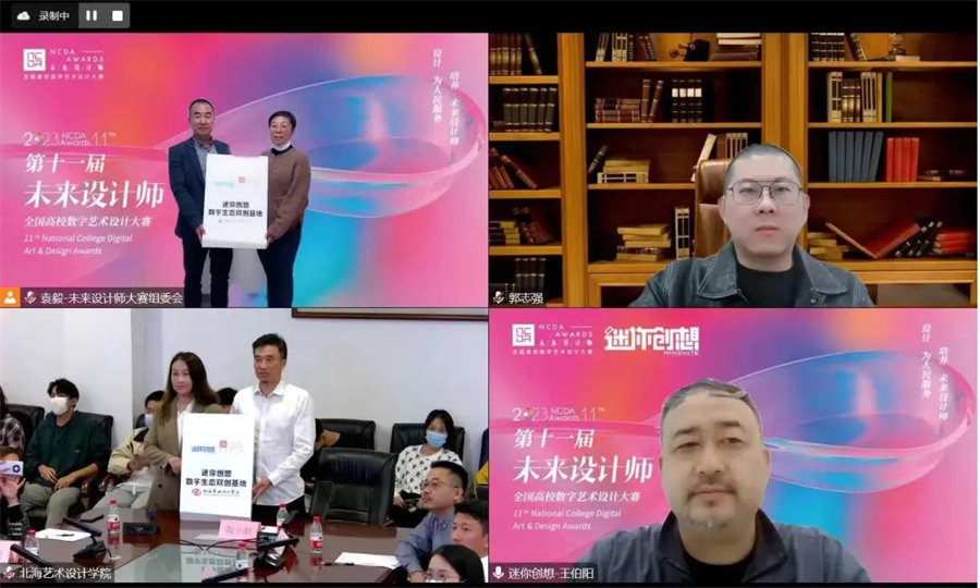 组委会与迷你创想产业研究院王伯阳院长为获得“未来设计师——迷你创想”数字生态双创基地的高校单位授牌 图源/未来设计师NCDA大赛