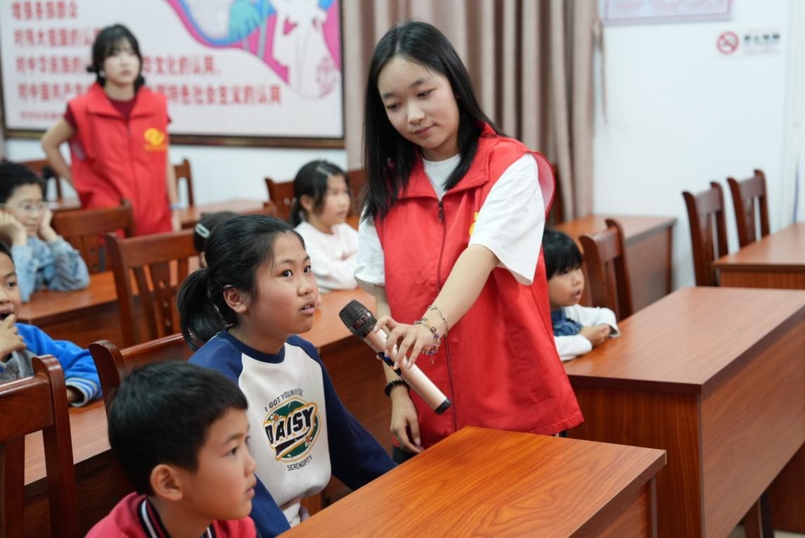 在充满欢乐的音乐课上,志愿者将动作、语言、节奏紧密结合,让学生们感受咸水歌里的岭南风情,体会不同音乐带来的多重情感。通过解析歌曲中蕴含的人文精神和家国情怀,不仅点燃孩子们对音乐探索的热情,还教会了孩子们用音符传递疍家人对生活的热爱。