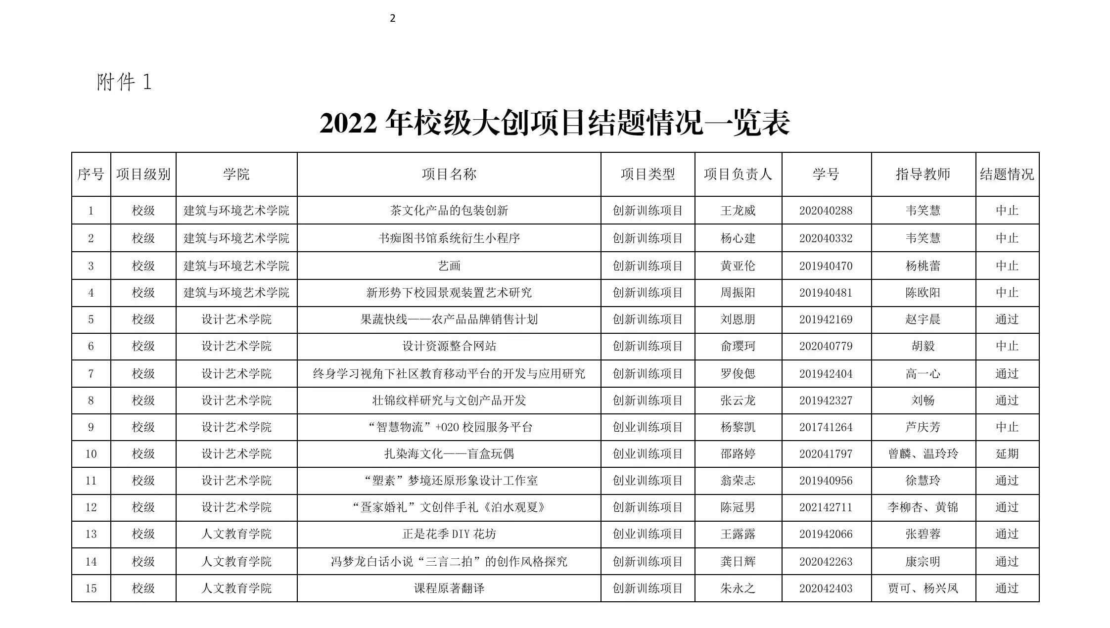 附件:1.2022年校级大创项目结题情况一览表