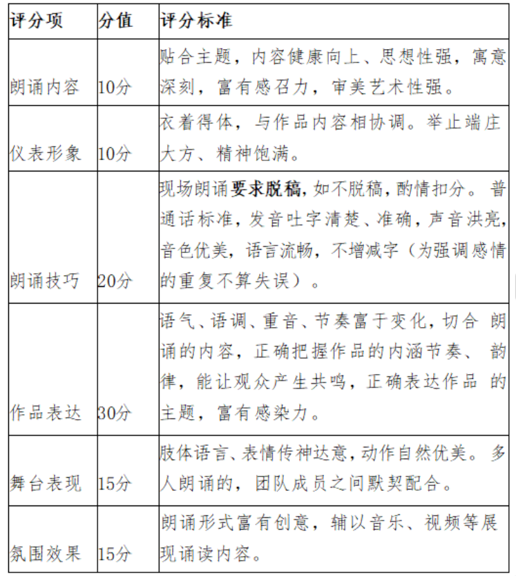二、复赛:专家评审团按照《复赛评分标准》(见表1)对参赛作品进行打分,根据得分排名分别选出各组24个作品进入朗诵大赛决赛。