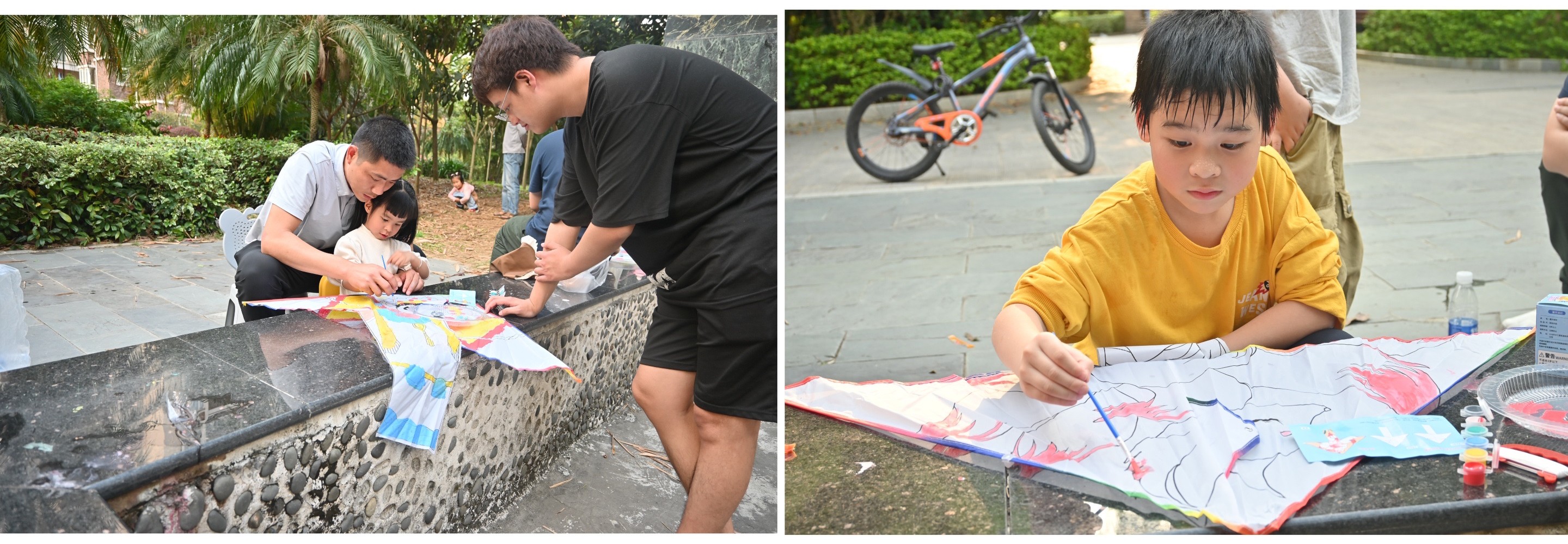 活动开始前,工作人员提前准备了风筝和颜料。活动开始后,橄榄苑小区的广大居民热情参与,特别是小朋友们兴致最高,他们用颜色尽情填充内心的五彩斑斓,创意涂鸦充分展现了他们的想象力和创造力。