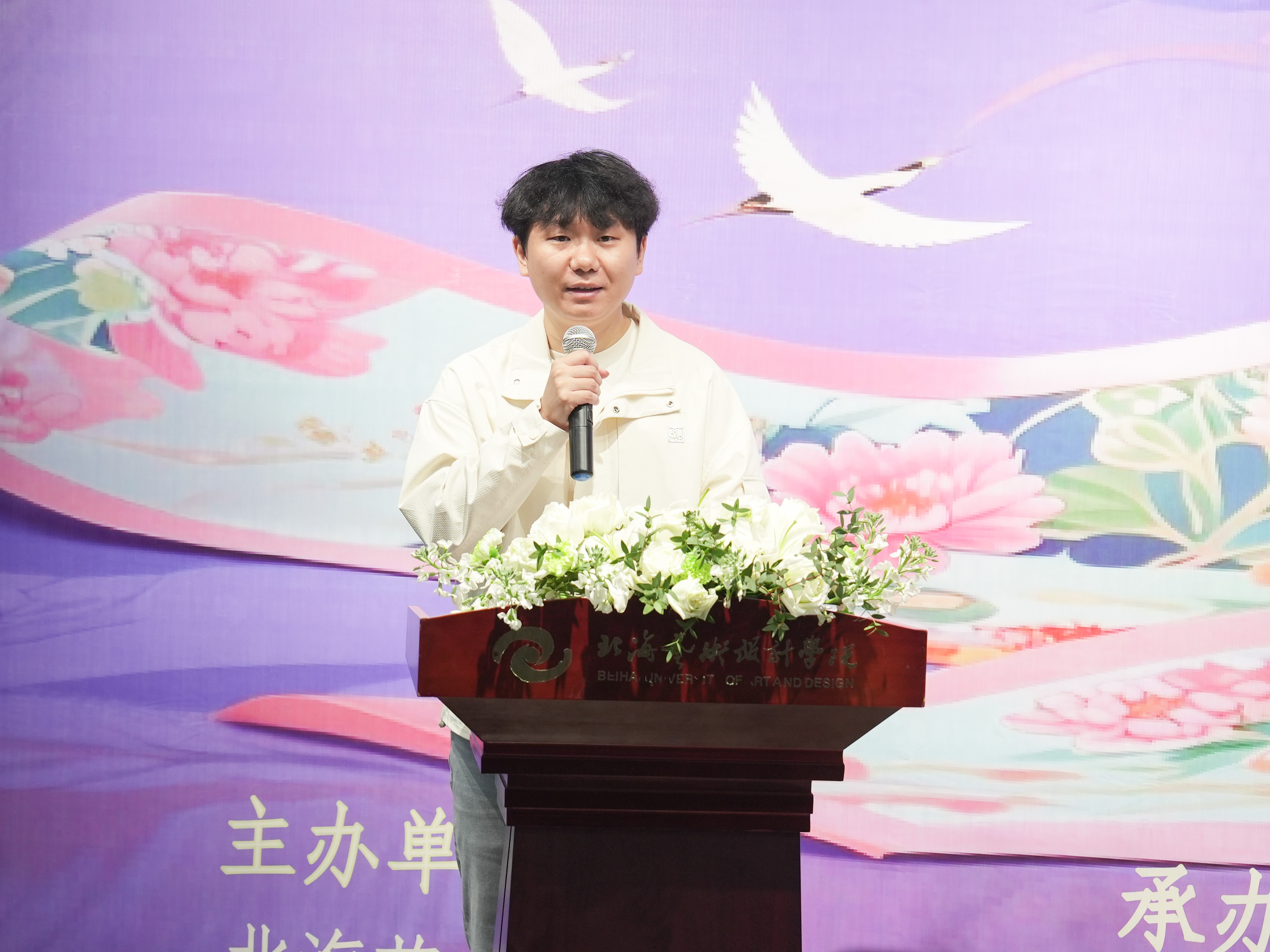 开幕式上,校团委书记唐良春在讲话中充分肯定了本届大赛的组织工作与核心立意,大赛为师生搭建了优质的创意交流平台,集中展现了参赛学子的设计巧思与创作热忱。参赛作品将北艺精神、北海风情与校训内涵融入丝巾设计,生动呈现了学子扎根文化、大胆创新的青春风采,对推动校园文化建设与美育工作具有重要意义。