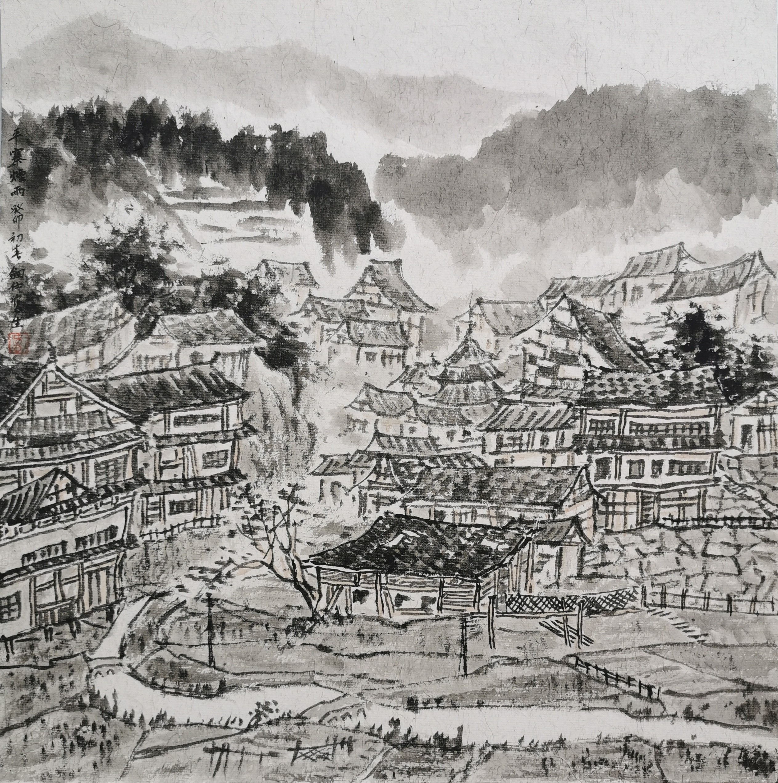 《平寨烟雨》 45x45cm