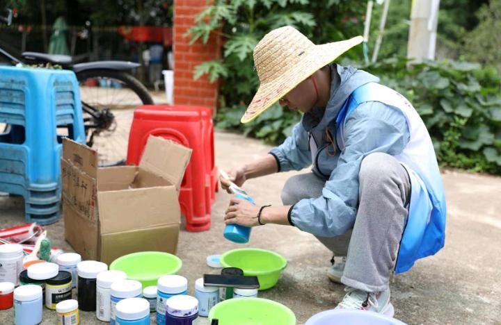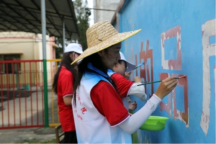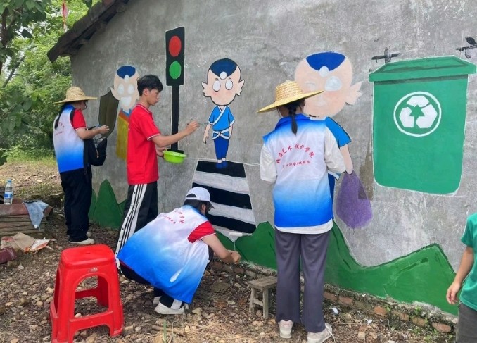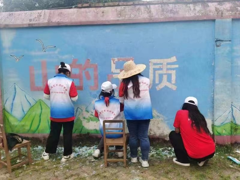 616下午实践活动结束后,在美术学院分团委副书记许荣军老师带领下,美术学院各个学院分团委的志愿者们给红锦村村民家中的墙面进行设计与绘画给枯燥的房子增添了一抹亮丽色彩,为乡村振兴奉献自己的绵薄之力。