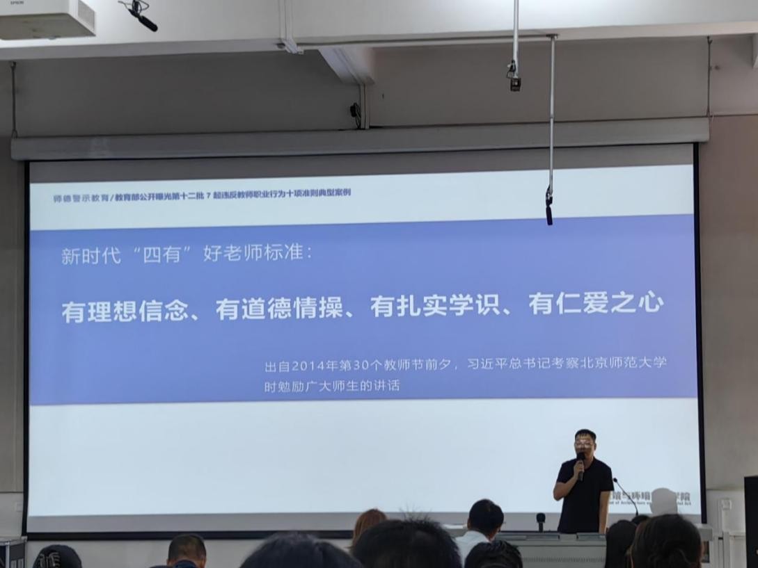 学习过程中,除了带领大家对《新时代高校教师职业行为十项准则》内容的解读学习外,庞书记还列举了违反师风师德规范的警示案例,提醒引导我院全体教职工人员要时刻谨记师德师风建设要求,牢记高校教师的育人使命,自觉提高师德修养,以身作则,严格自律。