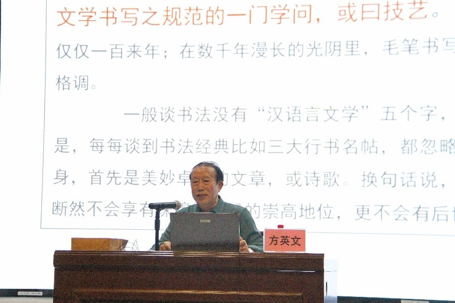 在书法鉴赏的讲授中,方英文先生指出要破除偏见、重“气”轻“相”,不可仅凭外在形象简单评判书法水平。书法的精髓在于“气”——即笔墨间流动的生命力与书写者的心境流露。他以李唐、两宋书法为例,说明优秀作品承载的时代文化精神,并强调书法风格无高低之分,鉴赏时应关注作品背后的情感与故事,而非单一标准。
