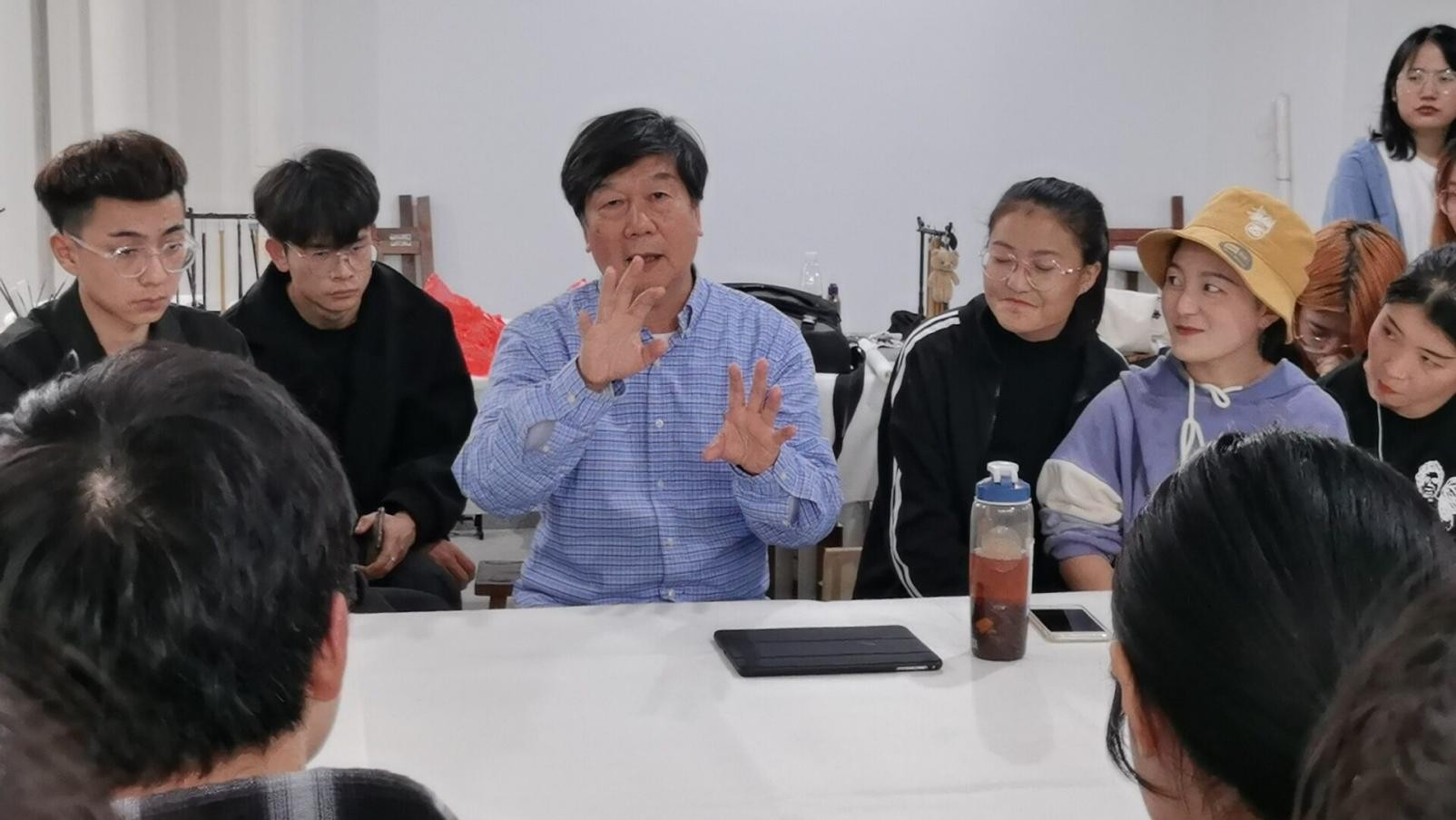 蔡教授通过幽默的语言热情地为学生们答疑解惑,现场气氛和谐,融洽欢乐与掌声并存。此次范画活动令现场师生受益匪浅,也为美术学院的教学环境做出了良好的氛围提升。(陈建江 摄)
