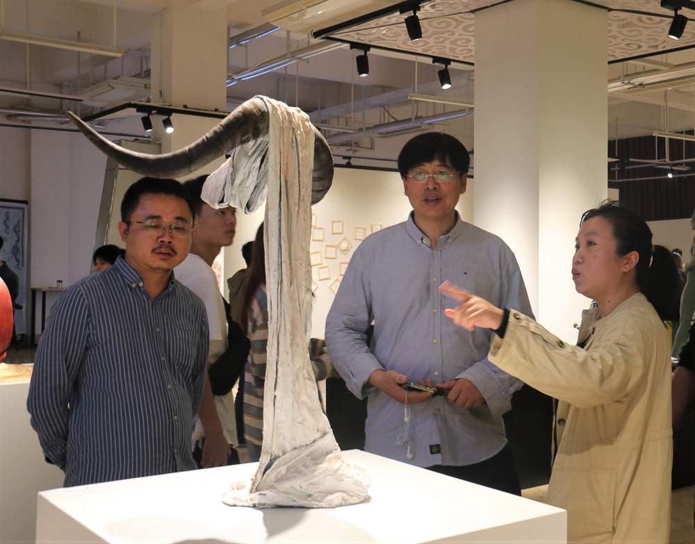在展览中,学校领导有幸来到了展览现场观看展览,对每件作品都认真审阅,并由雕塑专业老师详细讲解了作品的形式与内涵。对这次展览的成功举办非常赞许,对学生的学习成果也是非常满意。