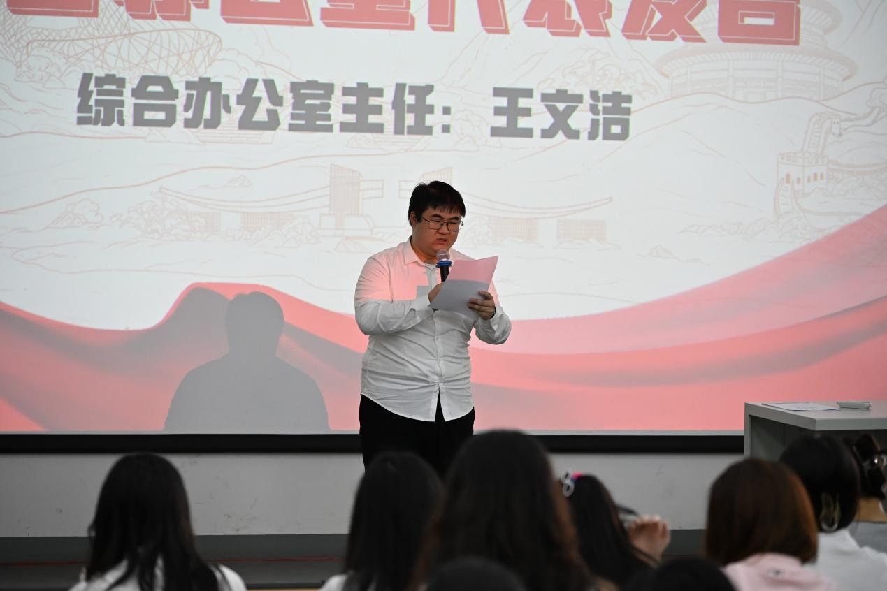 会议伊始,文学院党支部书记岳莹为大会致辞。岳书记首先对分团委成员在过去一年中的辛勤付出给予充分肯定。无论是迎新志愿活动中烈日下的执着坚守,还是团支部深入社区促进文化融合的不懈努力,抑或是积极参与学院各类展览与会议的忙碌身影,成员们的辛勤付出始终清晰可见。岳莹书记指出,要切实做好“老带新”工作,将宝贵的工作经验传授给新加入的干事,以助力他们更快、更好地融入分团委的工作环境。同时,希望成员们珍视分团委这一平台,把握宝贵机会,持续提升个人能力,展现文学院学子的青春奋斗