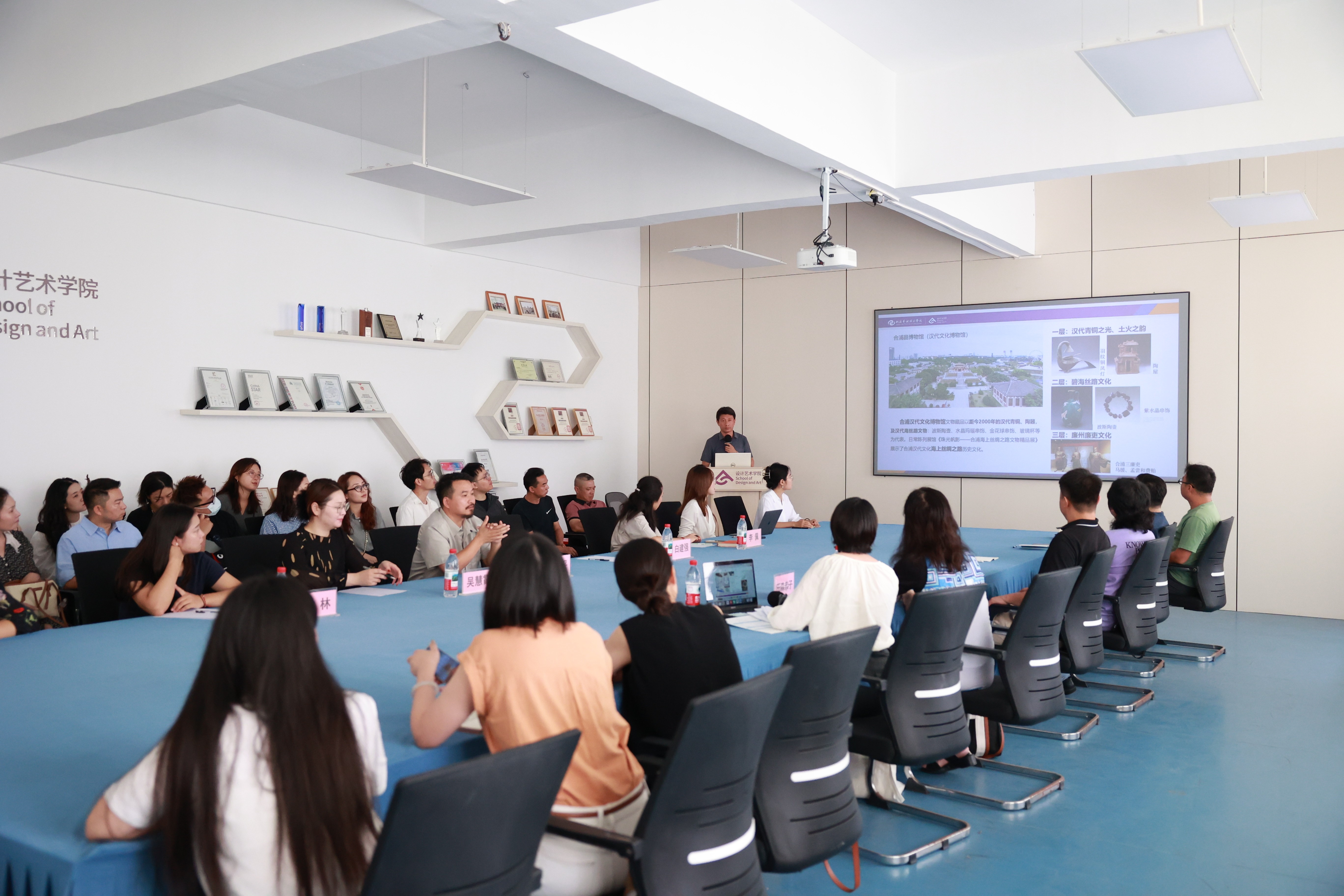 随后,白建强副院长围绕“馆-校联动文化创意人才培养实践进行了专题汇报,展示了师生基于合浦汉代文化博物馆文物元素所创作的一系列文创设计作品。这些作品融合传统纹样与现代色彩,运用AI生成、3D打印等技术,体现了学院在文化创新与设计实践方面的探索成果。
