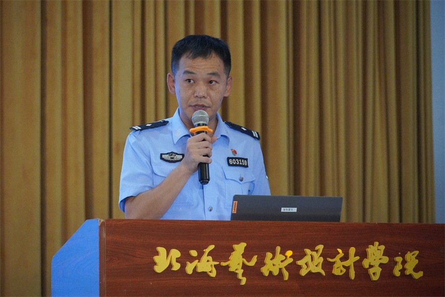 活动伊始,北海市公安局银海分局政工科主任李磊致辞,他表示反诈防诈工作需要警民同心、共同推进,期望借助此次活动,进一步推进全民反诈,保障师生财产安全。此外,他还以学生安全问题为核心,具体从日常安全、心理安全、网络安全等方面对我校师生作出了安全防范提醒。