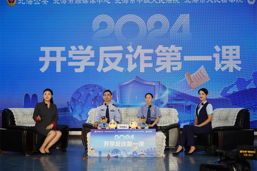 在现场热烈的掌声中,由北海市公安局联合北海市融媒体中心、桂林银行北海分行共同策划的《开学反诈第一课反诈知识进校园》节目正式开始录制,我校600余名师生共同参与节目现场录制。节目中,主持人和反诈民警、检察官、法官嘉宾与现场同学互动探讨预防电信网络的相关知识。他们分别从各自的工作出发,以亲切的语言、生动的案例和深入浅出的讲解方式,向现场学生详细讲解了常见的电信网络诈骗手段,以及如何预防电信网络诈骗。