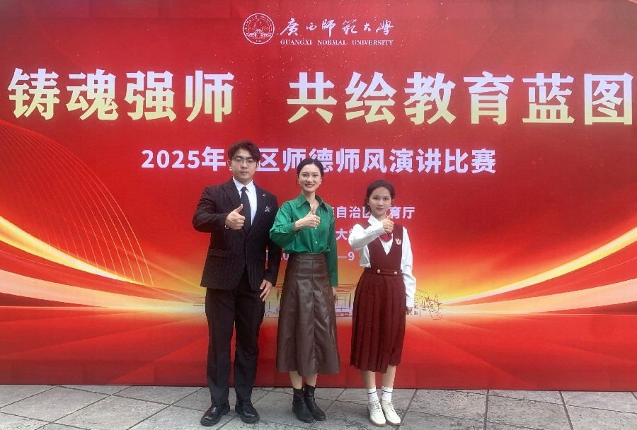 11月8日至9日,由广西壮族自治区教育厅主办的以“铸魂强师,共绘教育蓝图”为主题的2025年全区师德师风演讲比赛在广西师范大学育才校区成功举行。教育学院学前教育专业两名学生参赛,经过激烈角逐,丁朝旭同学凭借出色表现荣获高校师范生组二等奖。