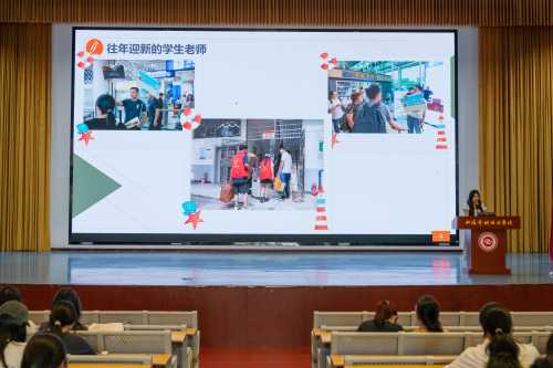 优秀迎新志愿者代表高欣怡上台分享经验,她结合自身参加迎新工作的经历告诉大家在迎新过程中应该如何高效引导新生和家长,面对突发状况时如何灵活应对、妥善处理。此外,她还重点说明了志愿者在志愿服务过程中要时刻保持良好形象、与新生和家长交流时要礼貌真诚。