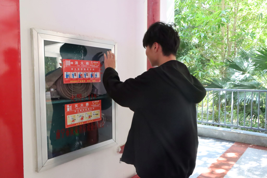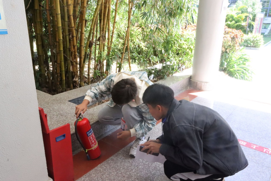 一组成员对教学楼的消防器械进行逐一的检查。通过翻开消防箱的箱门,检查消防用水管的完整性,确认灭火器的使用日期等措施来确保消防器械的安全性。