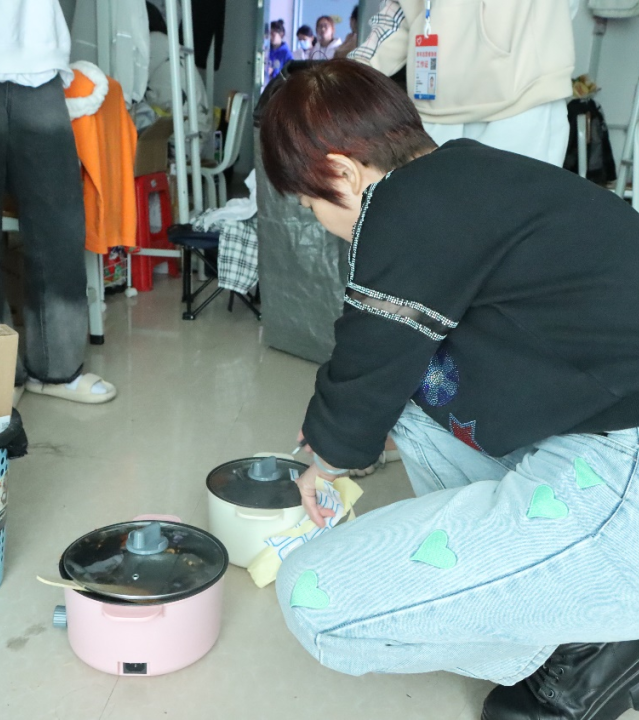 一组成员进入女寝,在舍管阿姨的带领下对楼层宿舍进行违规电器的抽查。