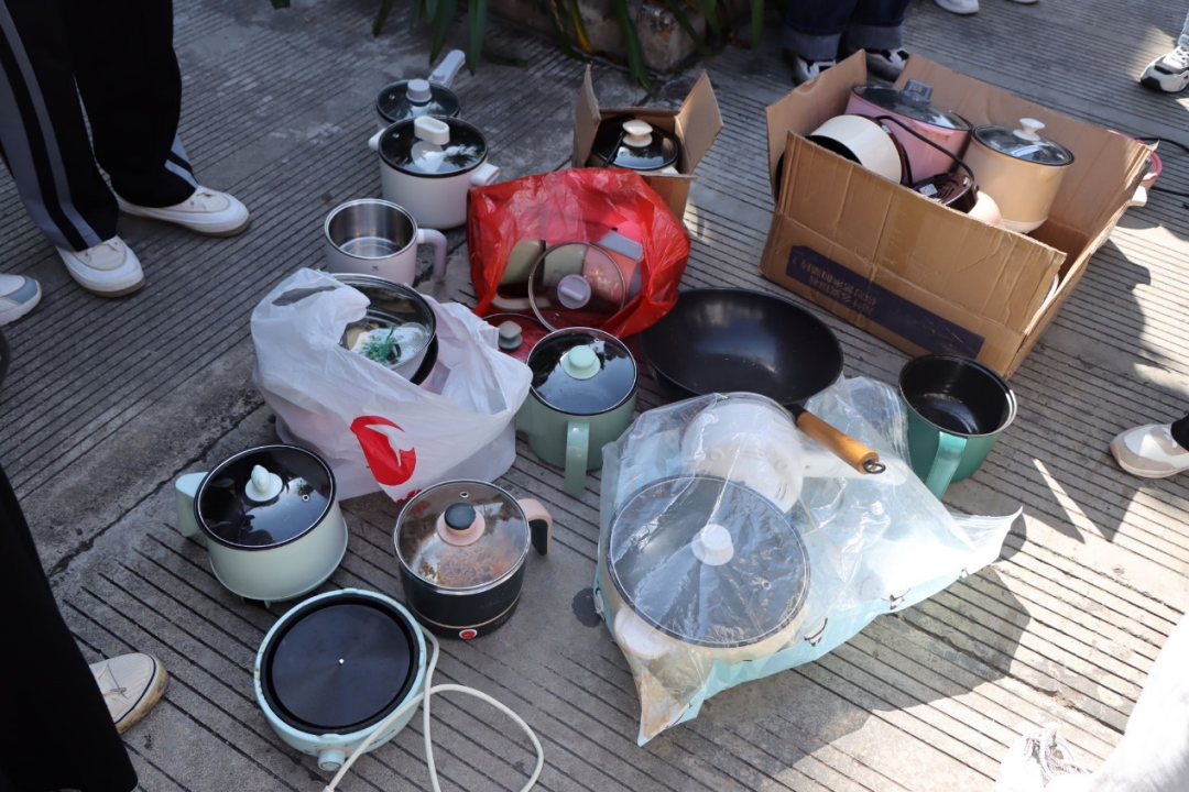 集合后,映入眼帘的是各式各样的小型电热锅,通过这次的抽查结果极大反映了校园学生的消防意识弱的问题。