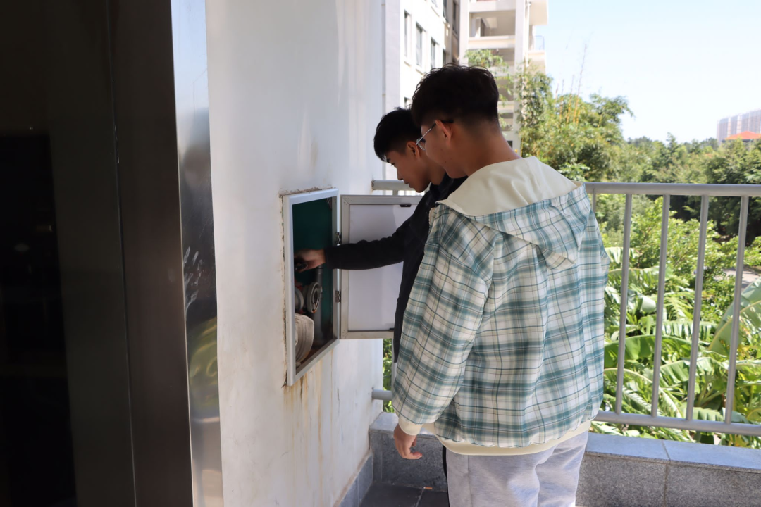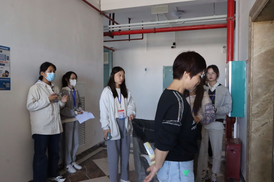 一组成员进入男寝,在舍管阿姨的带领下对男寝的消防设施进行排查。